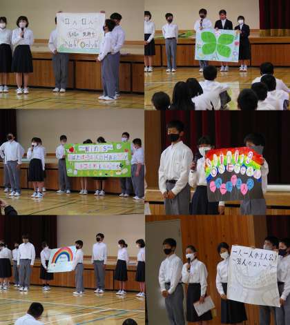 1年生では学活の時間を使って、代議員会主催による学年目標および各クラスの学級目標の発表会を行いました。