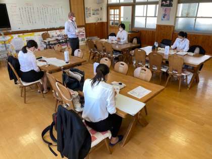 本日5月31日(月)より6月18日(金)までの3週間,教育実習が行われます。今年は4名(国語科・理科・音楽科・英語科)の将来教員を目指す大学生が教壇に立って実習を行います。下記の写真は校内オリエンテーションの様子です。実習生の皆さん、3週間頑張ってください。