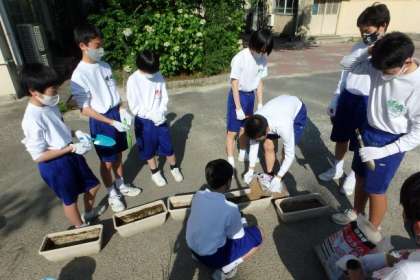 昨年度,嵯峨中パレードでマスク作りをし,福祉施設へ配布させていただきました。そのお礼として朝顔の種をいただきました。その種を美化委員会で植え,大切に育てていこうと美化委員長が提案し,今回の取り組みとなりました。