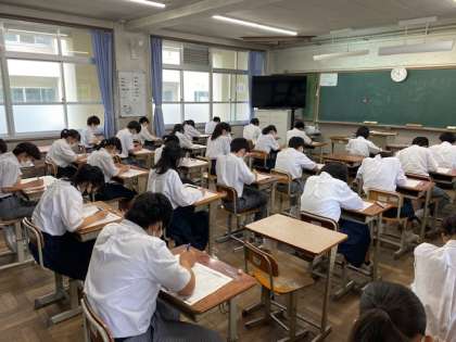 2年生は本日3教科のテストを受けました。出来はどうだったでしょうか。土日を挟んで残り2教科を月曜日に実施します。ぜひ予習シート等を使って,今回の範囲の復習に取り組んでください。