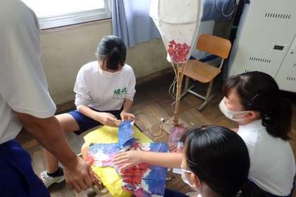 先日,和紙染めを行いましたが,その和紙を使用し,嵯峨嵐山の風景などを和紙で表しました。