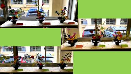 伝統文化部では,「いけばな」に取り組んでいます。過去に取り組んだ作品を,北校舎東階段の踊り場の掲示板に,実物作品を中校舎1階廊下(校長室前)に展示しました。