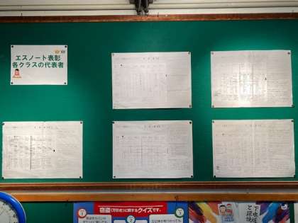 この取組は,毎日のスケジュール管理や振り返り,そして見直しができる手帳(エスノート)をいかに有効活用しているかについて,年1回コンテントを行い,学級代表になったエスノート1週間分を展示しています。