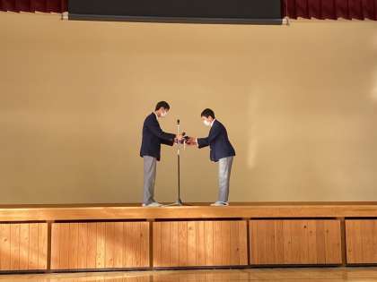 本日6限に第54期生徒会本部役員の認証式と後期学級役員の認証式を行いました。また,第53期生徒会長から第54期生徒会長へと生徒会旗の引継ぎも行われました。(体育館から自主放送システムで各教室のテレビに映し出すリモート形式で行いました。)