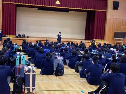 校長先生のお話があり,修学旅行実行委員からあいさつや諸注意があり,添乗員さんと写真屋さんの紹介を行いました。今日からの3日間,感染対策をしっかりとしながら,楽しい修学旅行にしていきます。