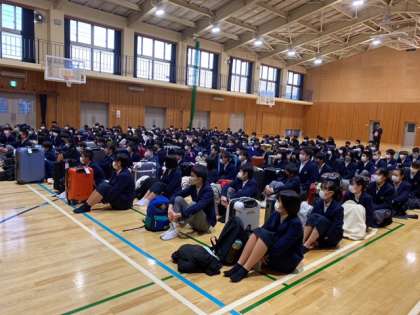 まだ夜が明けていない6時15分に集合し,体育館にて修学旅行の結団式を行いました。