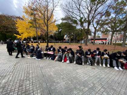 広島市の平和記念公園に午後1時頃に到着しました。公園内にて,各クラスごとに昼食をとっています。朝早い中,お弁当のご協力ありがとうございました。この後,平和セレモニーを行います。