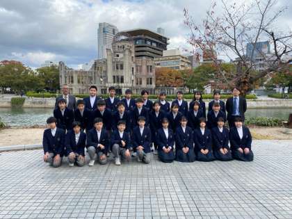 現在,広島平和記念資料館での見学中です。先ほどの平和セレモニー前にクラス写真を原爆ドームを背景に撮影しましたので掲載します。