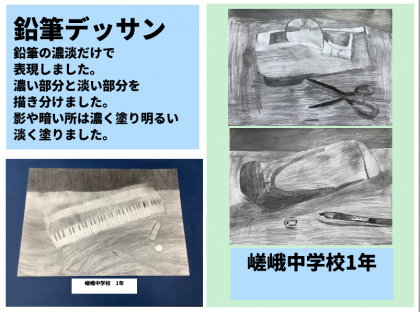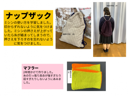 鉛筆デッサンは1年生の作品です。美術の先生から教えていただいて中学生らしい本格的な仕上がりになっています。マフラーは編み目の美しさにご注目ください。ザップザックは3年生の作品です。これまでの学習を生かして,ほぼ助けを借りずに自分だけの力で完成させることができました。