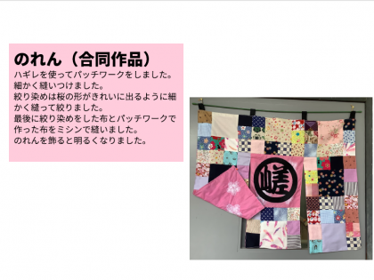 初めは,全員で作ったのれんです。しるし通りに縫うのに苦労していた人もいましたが,協力して作ることができました。