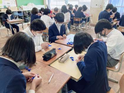 5月2日(月)4限に,修学旅行前の平和学習の一環として,3年生の各クラスで千羽鶴づくりを行いました。修学旅行実行委員の指揮のもと,一人ひとり折り紙に平和を願うメッセージを書き,心を込めて作っていました。完成した千羽鶴は,修学旅行当日に平和記念公園でのセレモニーで納められます。みなさんの平和の祈りが届きますように…!