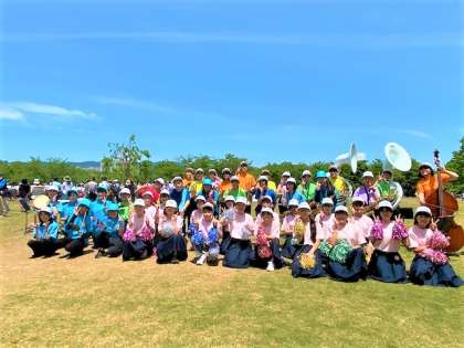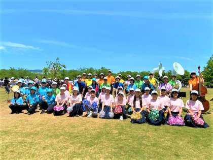 下の写真は,第1部の交流会(交歓コンサート)での様子と,その後に全員での記念撮影したものです。記念撮影の際は整列が完了した状態で,撮影時のみマスクを外しております。