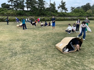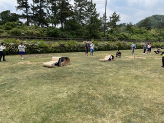 芝生の広場でキャタピラリレーを楽しんでいます。