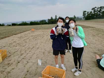 鳥取砂丘名物のらっきょうを収穫させていただきました。農家の方から説明をしてもらい,さっそく収穫です。砂の中からスルスルと出てくるらっきょうの根を切り,ボトルに詰めてお土産とします。レシピも教えてもらえるそうなので,家庭で美味しい食べ方を研究してください!