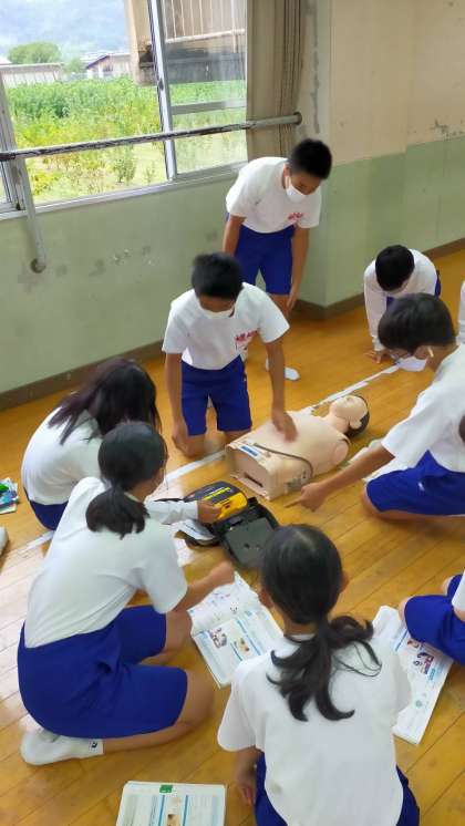 心肺蘇生やAEDの使い方を実際に使用しながら学びました。心臓マッサージで必要な強さの難しさやAEDの使用方法などに戸惑いながらも、真剣に授業を受けていました。