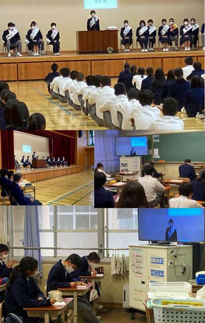 今回の立会演説会は、感染防止対策のために、生徒会本部役員立候補者は、体育館で2年生の前で演説し、1年生と3年生は教室で自主放送システムをでそれを聞くという変則的な形で行いました。