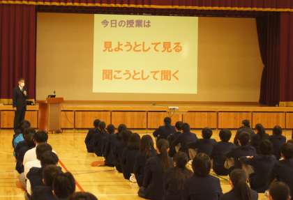犯罪やいじめがなぜ起こるのか、さらにはスマホ・SNSの使い方、薬物に関わるトラブルについてのお話をしていただきました。他人事ではなく、自分事として考え、ちょっとした悪ふざけや言動がトラブルに繋がることを学びました。今日の学習をこれからの生活につなげていってほしいと思います。