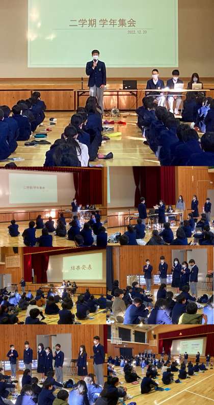 12月20日(火)1限、1年生では学年集会を行いました。そこでは、代議員を中心に、あらかじめ話し合った各クラスの反省や課題を発表し、クラスを良くする取り組みの成績発表や、クラスの素敵な人の表彰など、様々な方向から2学期を総括し、3学期に向けてより良い学年にするためにどうすべきか、その方向性を確認しました。その後、学年教師より、学習や進路について、冬休みの生活について、また、新年を迎えるにあたって、今後各自がどのように行動すべきかの話がありました。