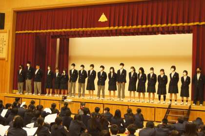 生徒会本部役員による各専門委員会の紹介を行い、続いて各部活動部長による部活動紹介を行いました。生徒会本部役員も部長も凛とした態度で紹介をし、1年生もその姿を見て、真剣に話を聞いていました。1年生は委員会や部活動について聞き、これからどの委員会・部活動に所属するのかを決定します。