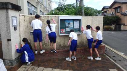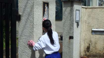 管理用務員さんの指示に従い、門柱の清掃を行いました。ブラシを使用して隅々まで丁寧に擦り洗いをして、見違えるほど綺麗になりました。