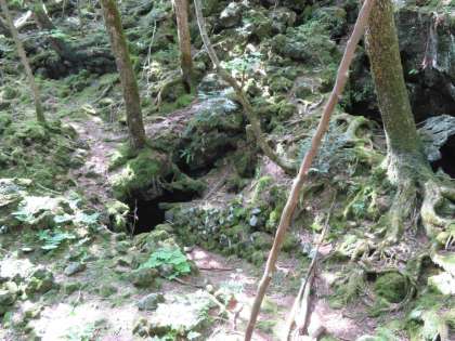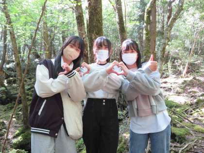各クラス男女別になり、ガイドさんの誘導のもと樹海を散策しました。足下のぬかるみや寒さが心配されていましたが、ちょうど良い気温で軽快に歩いていました。ガイドさんが溶岩の流れた跡や樹海の植生、動物の爪痕について、詳しく説明してくださいました。見て、触って、感じて、本当の学びができたと思います。ぜひこの経験を、これからの普段の学習に繋げていってほしいですね。