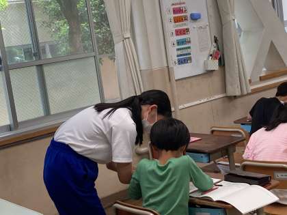 算数の授業でものさしの使い方を教えたり、体育の授業で体力測定の補助などを行いました。最終日の本日は、来年度中学生になる小学6年生に向けて中学校についての説明・発表もしました。緊張した場面も多々あったようですが、最後まで頑張りました。