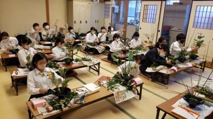 今回から新入部員7人も参加し、嵯峨の間は華やかな雰囲気になりました。自分で生けた後、池坊の先生に見ていただくのですが、手直しがなくほめていただいた作品もあり、生徒は大喜びでした。これまでのお稽古の成果が出てきています。