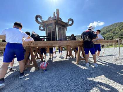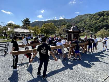 パレード巡行に向けて中之島公園で組み手の皆さんが御輿を組む作業を行っています。