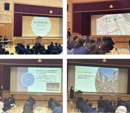 選ばれた生徒は、京都市長選挙立候補者として、それぞれの視点、角度から京都市について見つめ直し、出馬にあたっての公約、取り組みをまとめ、3分間で発表を行いました。発表の後には、右京区選挙管理委員会からお借りした実物の投票箱を使い、実際に投票の体験をしました。金曜日に開票結果が発表されます。今回の取り組みが、選挙や社会に目を向ける良い機会になればと思います。