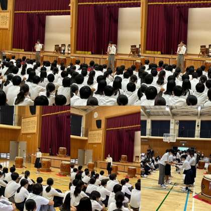 写真は壮行会で行われたリーダーの決意表明と1・2年生代表の言葉、うちわの贈呈の様子です。