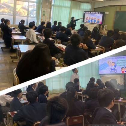 前期で実施した「人を大切にするとはどういうことか?」に続き、後期は「障がいのある方たちの人権問題」について考えました。5限目は、車いすを使用している友達との活動について話し合いました。「みんなが楽しめるドッヂボールの工夫」「階段を使わなければいけない昼食場所への移動」など、いろいろな場面を想像しながら、意見を出し合いました。6限目は、パラリンピックなどの取組を通して、障がいのある人達の人権について考えました。そして、多様な人たちが共に生きる社会について議論を深めました。