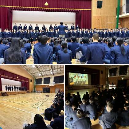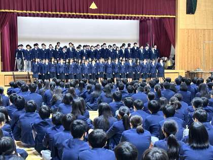 1年生は先輩への思いを群読で伝え、そして「僕らまた」を合唱しました。2年生は全員の思いを動画や代表者の言葉で伝え、「僕らは生き物だから」を合唱しました。お世話になった3年生に、ありがとうの気持ちはもちろん、これからの嵯峨中を任せてほしいという決意を示す場となり、受け取ってくれた3年生の表情も素敵でした。