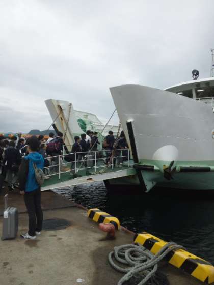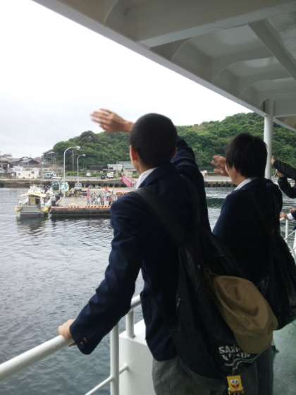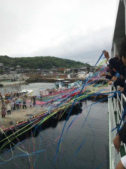 青島地区 離村式が終わり、フェリーに乗って御厨港に向かっています!みんなとってもいい顔で帰ってきました。お世話になったお父さんお母さんと別れを惜しんでいます。ありがとうございました!
