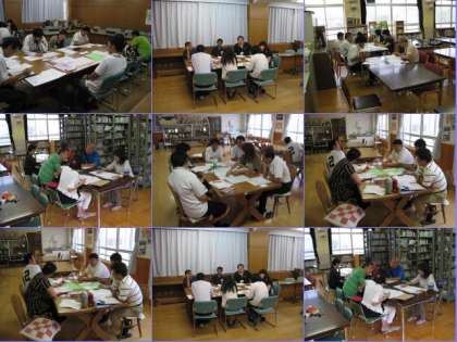 日本の公立中学校の教育活動で,生徒のよりよい成長という成果を得るためには,学級集団の質の向上が重要な課題となります。本校では,「いごこちのいい学級づくり」を目指すことで,「確かな学力」・「豊かな心」等の育成が促進できると考えています。そこで,Q-U調査を実施し,これをもとに学級経営を考えていくためのK-13法を使った研修をもっています。5年目となりますが,グループごとに分かれた教職員は,これからの学級経営について真剣に考えました。この第1回目の研修会は,7月4日(木)の放課後に実施されました。