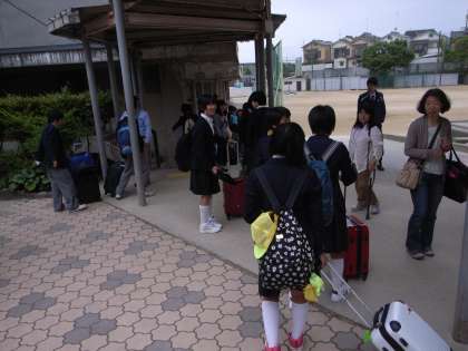 修学旅行1日目です。PTAの方も見送りに来ていただきました。伊丹空港に向けて7時15分に無事出発しました。