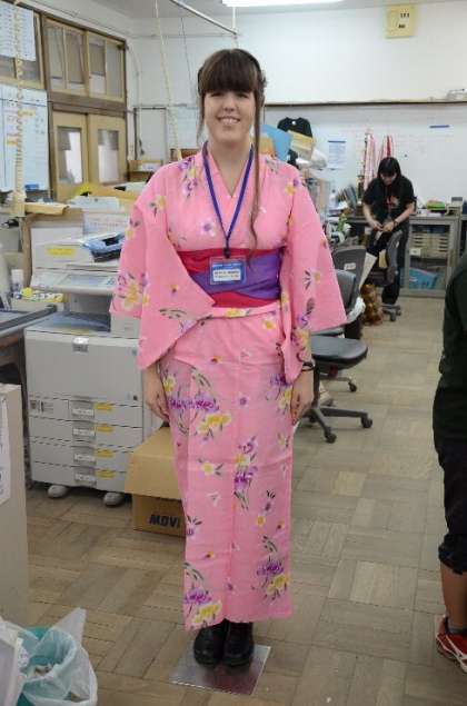 校内で更衣しています。ALTも浴衣で参加します。