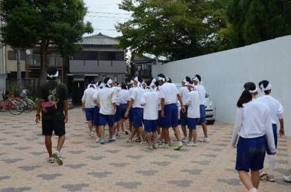 第2団の応援,配布,幟,音響が中之島公園にむけて出発しました。