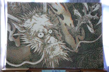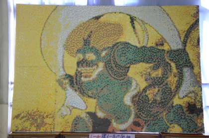 嵐山の天龍寺をはじめ,京都の禅宗のお寺にある龍の貼り絵と,教科書にも載っている風神雷神図をデジタル貼り絵で仕上げました。クラスで1つ作品を決めて,各絵を6班で分割分担し,1cmの色紙を貼り合わせて制作しました。