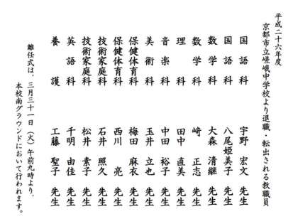 今年度,嵯峨中学校から退職・転出される教職員は以下のとおりです。