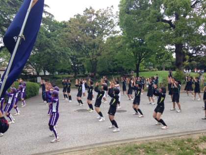 好天のもと,春季総合体育大会の開会式が行われました。行進の直前に「嵯峨中のために」を行い士気を高めていました。