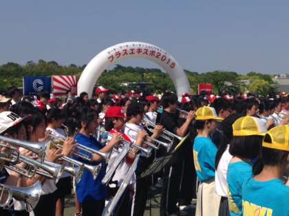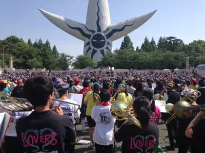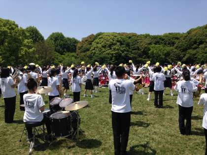 5月10日(日)大阪府吹田市の万博記念公園で「ブラスエキスポ2015」が行われ、本校吹奏楽部も参加しました。このイベントは今年で29年目となり、初夏の恒例行事となりました。午前は京都府合同バンドの練習と交歓コンサートを行いました。本校も明日に本入部する16名全員とバンド全員がスタンツをつけて演奏・演技を行いました。