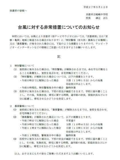 台風に対する非常措置については以下のとおりです。以下のリンクをクリックするとPDFデータが表示されます。
