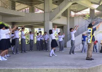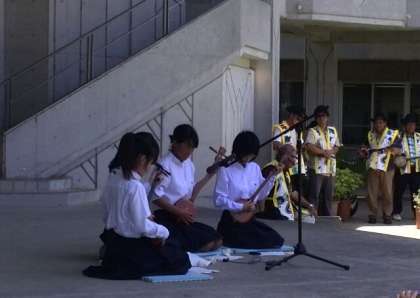 離村式では,昨日民泊先で練習をした「上を向いて歩こう」を三線で披露しました。また,沖縄民謡に合わせて踊っています。