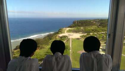 さきほどまで平和セレモニーをしてたあの場所…。沖縄戦の悲惨な歴史を目と耳で感じ,目をそらすことなく平和記念資料館で学習しています。