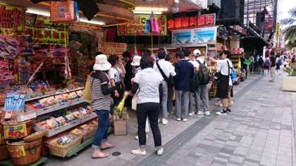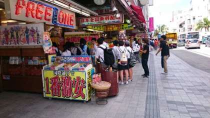 国際通りでの班別自主研修。計画で決めていた店や通りすがりの面白そうな店に立ち寄ったり。班ごとに沖縄の雰囲気を楽しんでいます。