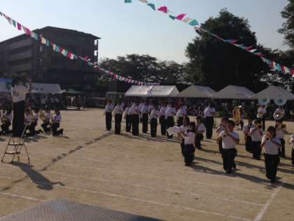 10月4日(日)嵐山学区民運動会が行われ、本校吹奏楽部が開会式の入場行進の演奏と開会式の式典演奏を行い、開会式後にグラウンドでマーチング演奏を披露しました。マーチングは10月25日(日)に右京ふれあい文化会館で披露するステージマーチングでの1曲目「トリステーザ」を演奏・演技させていただきました。たくさんの地域の方々に吹奏楽部の演奏・演技を見ていただく機会を与えていただきました。本当に体育振興会の方々はじめ関係者の皆様に感謝しております。本当にありがとうございました。写真はマーチング演奏・演技の様子です。