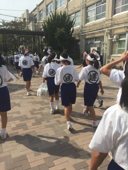 サポート隊です。1年生の有志の生徒が参加しています。JR嵯峨駅前でパレード隊の給水を行います。
