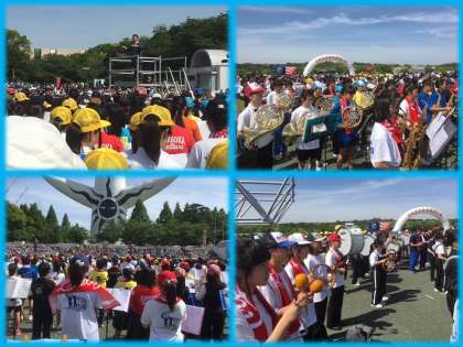 午後は全体フェスティバル「ブラス ア・ラ・カルト」として各府県の合同演奏や箕面自由学園チアリーダー部のチアリーディング教室発表などがありました。京都府吹連合同バンドでは行進曲「双頭の鷲の旗の下で」と「カーニバルのマーチ」を演奏しました。全員合同演奏では宮川彬良氏による指揮で「宇宙戦艦ヤマト」を演奏しました。そして最後に「星条旗を永遠になれ」を淀川工科高校吹奏楽部顧問で関西吹奏楽連盟会長の丸谷先生の指揮で演奏しました。最後にはみんな真っ赤に日焼けしていましたが、丸一日、吹奏楽三昧の素敵な時間を過ごすことができました。