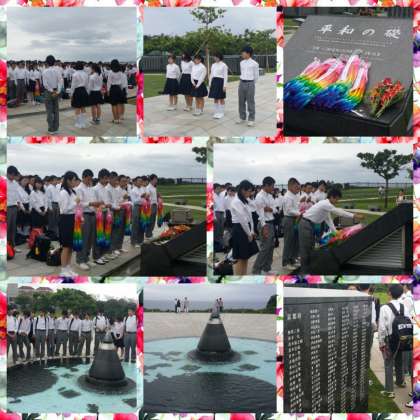 平和記念公園に到着。平和の碑において、修学旅行委員の平和セレモニー係の司会進行で、平和セレモニーを行いました。