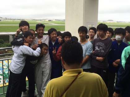 みんな基地をバックに写真撮影してます。